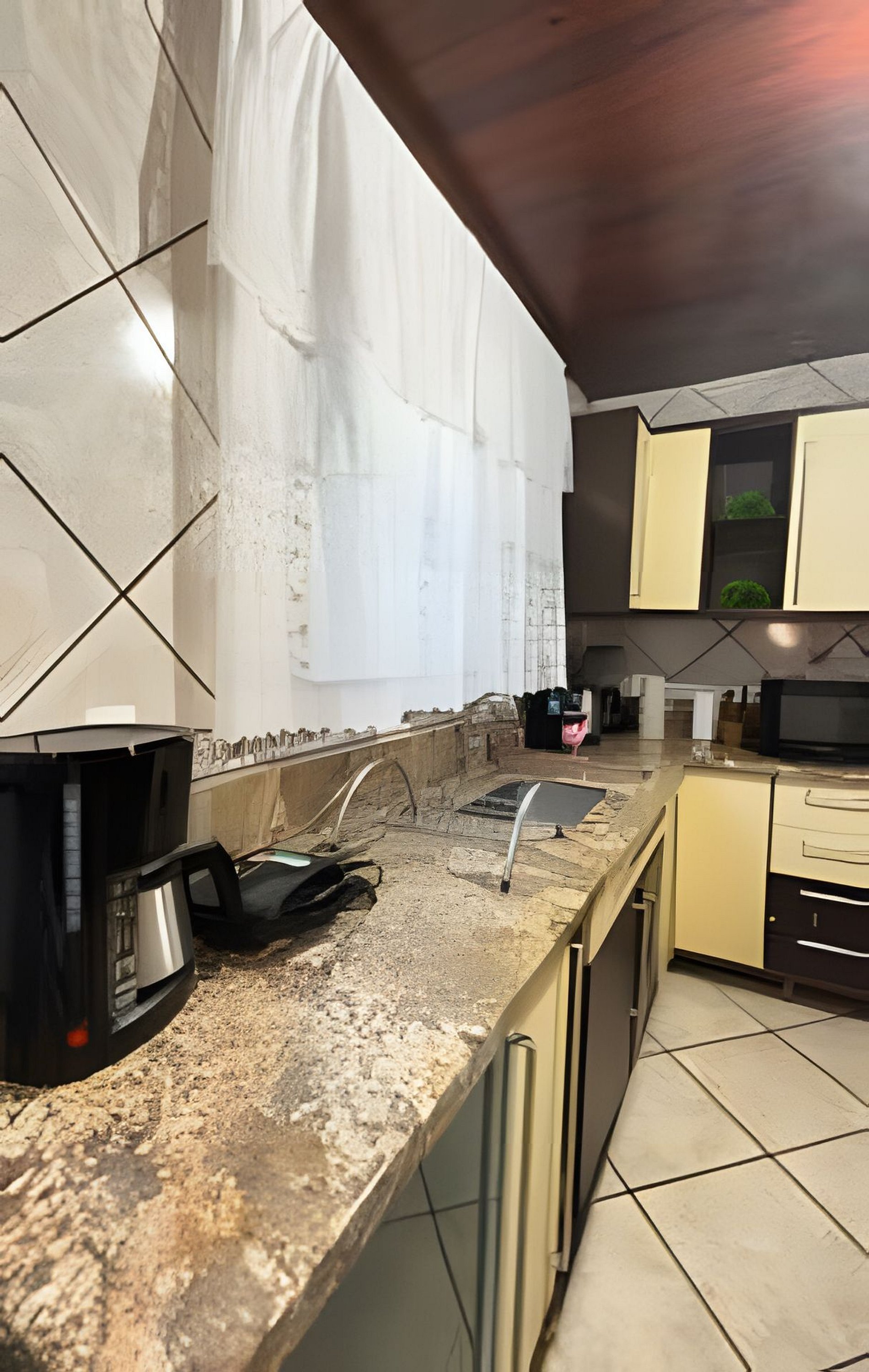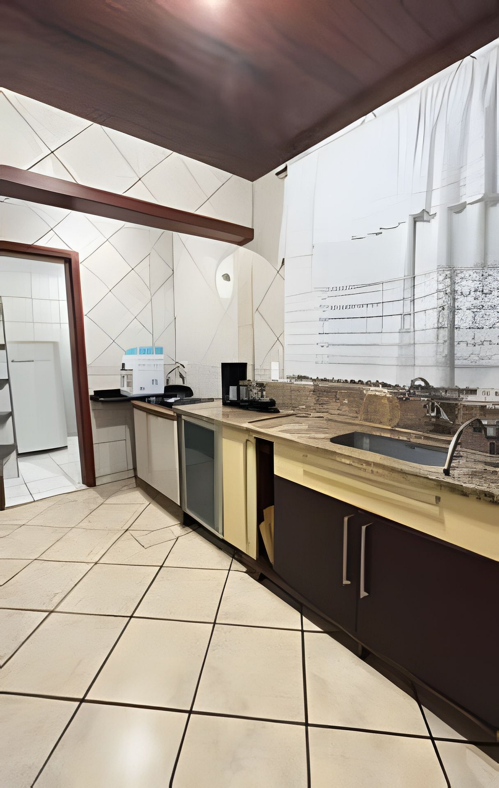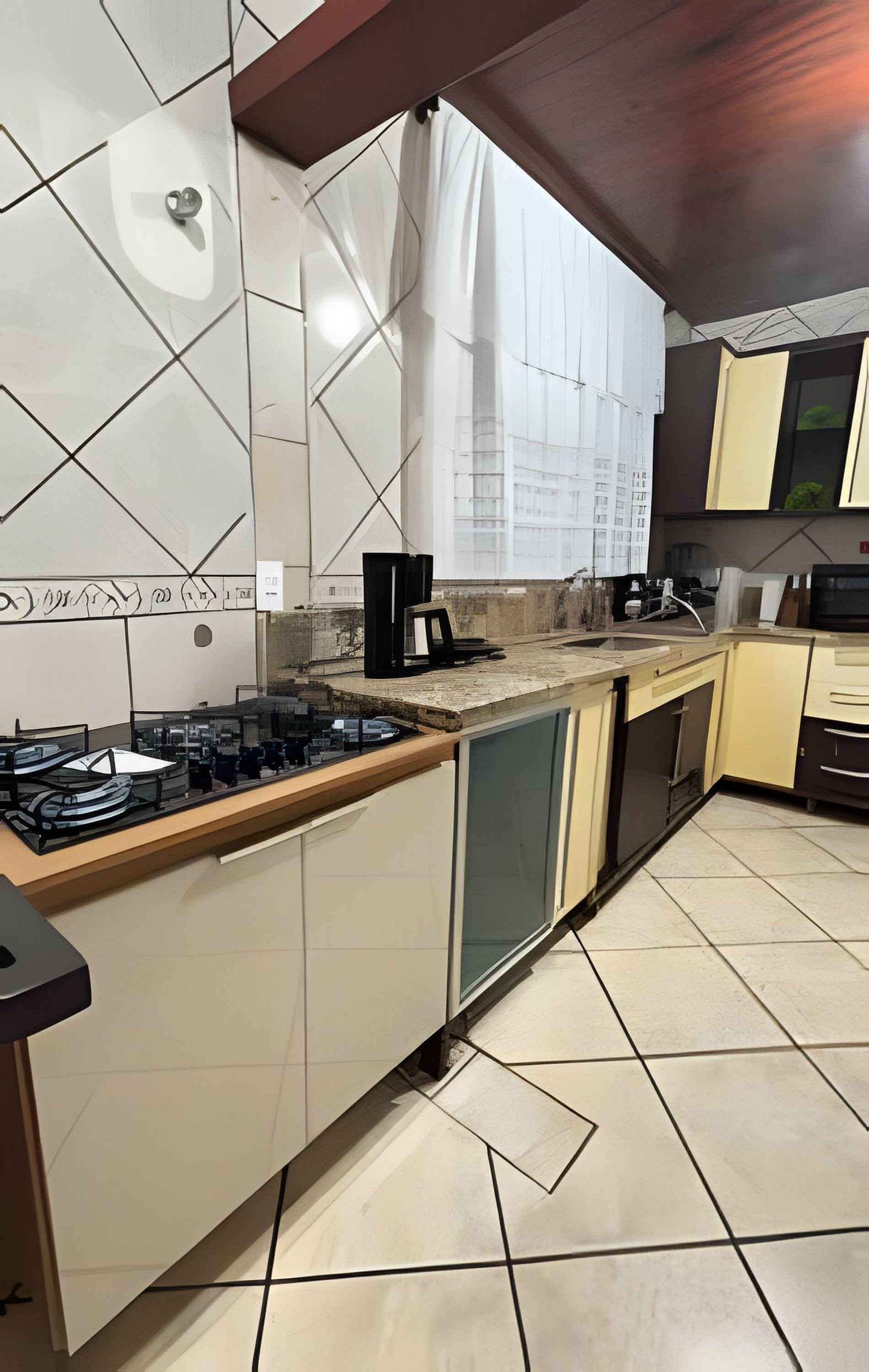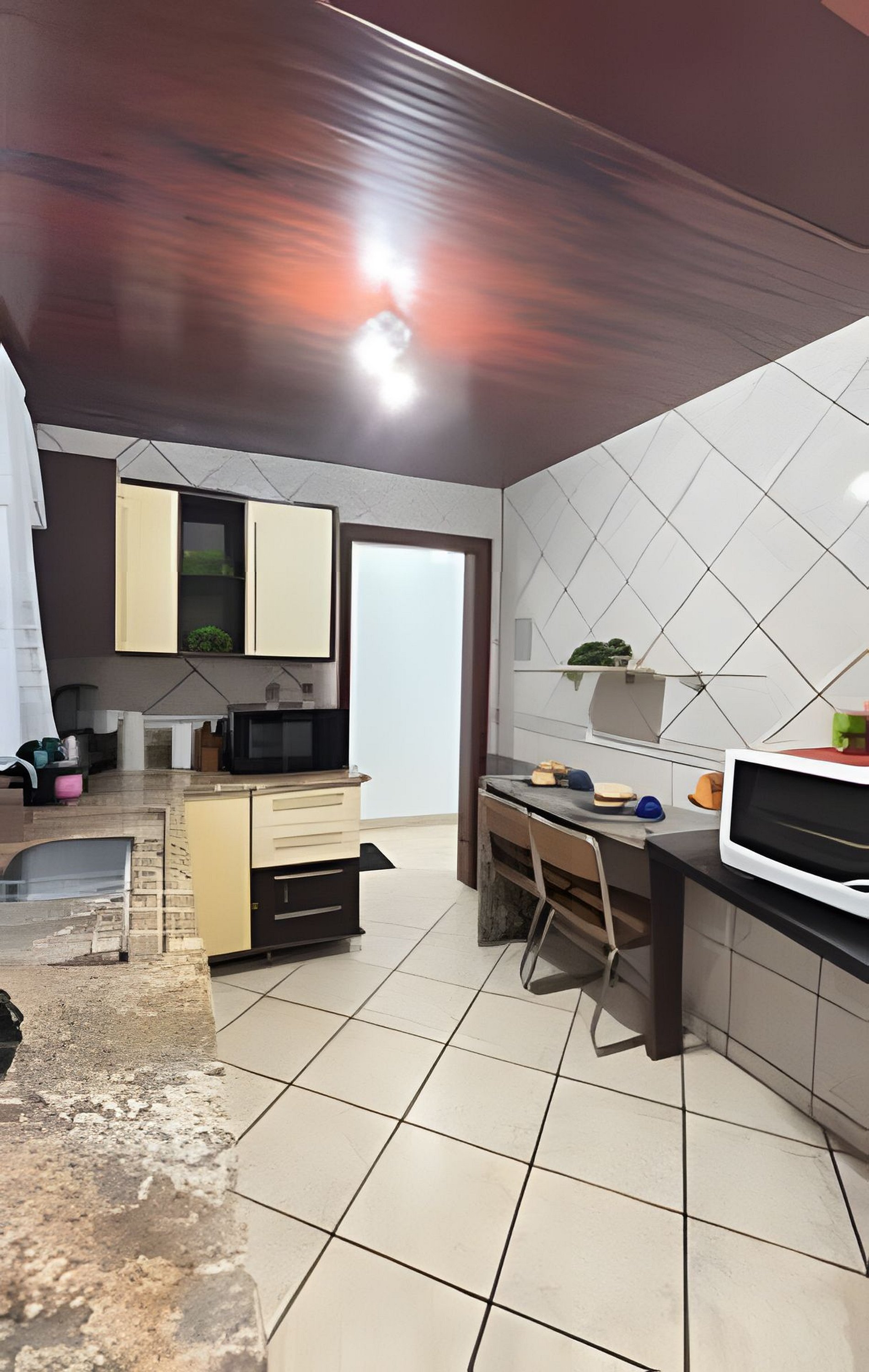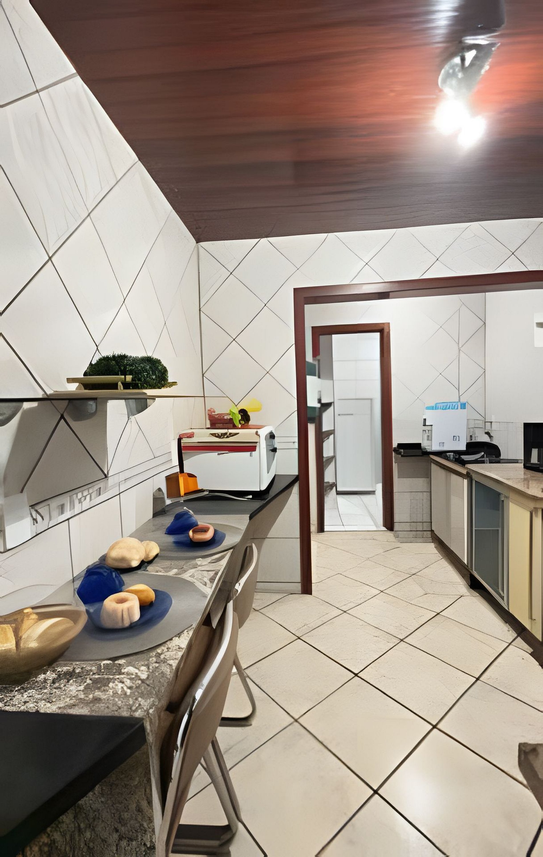 Cozinha equipada com diversos utensílios, fogão cooktop, forno, cafeteira, torradeira, jarra elétrica e micro-ondas